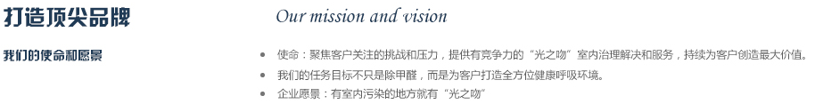 2012年公司斥巨資從德國專業(yè)空氣研發(fā)實(shí)驗(yàn)室引進(jìn)銳鈦型納米二氧化鈦研發(fā)成果,同時(shí)與國內(nèi)知名高校進(jìn)行合作,成立光之吻”品牌,致力于為人類創(chuàng)作純凈,健康的呼吸環(huán)境,成為你身邊的健康衛(wèi)士,實(shí)現(xiàn)365天健康呼吸的夢(mèng)想,目前是同類產(chǎn)品中最有競(jìng)爭(zhēng)力的品牌之一。